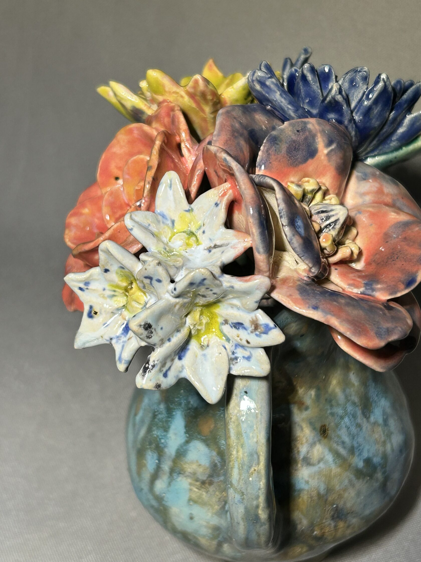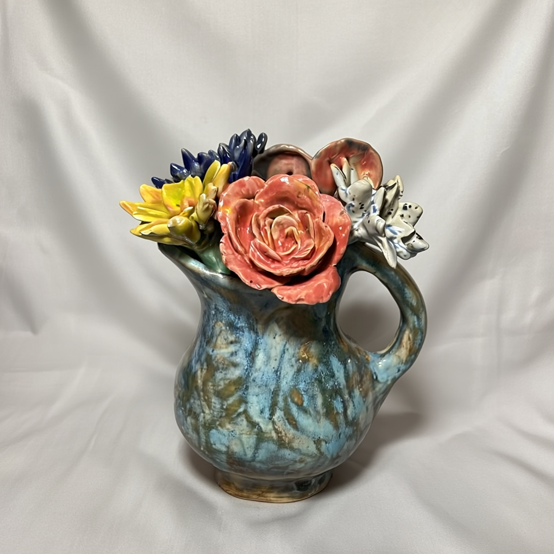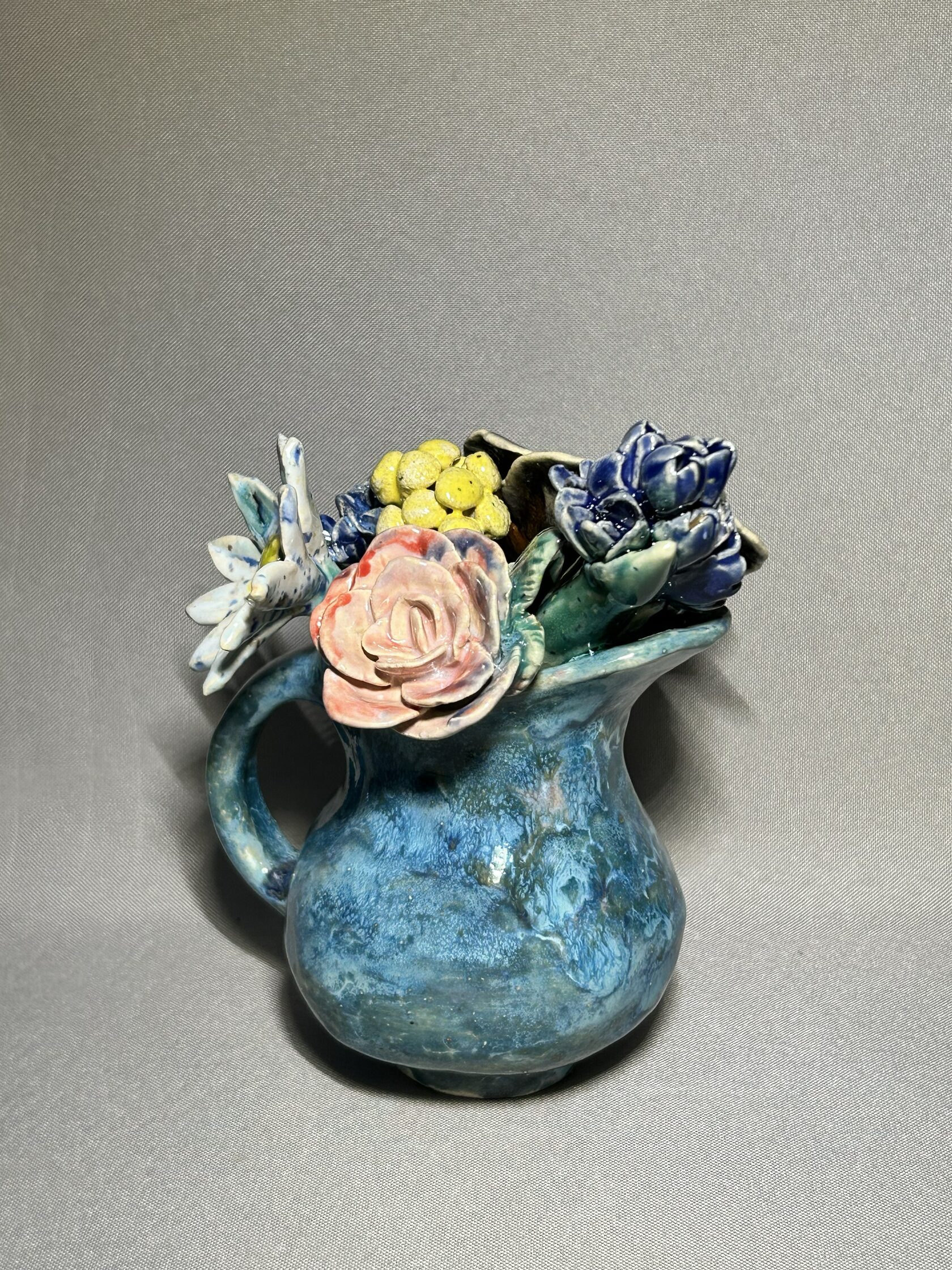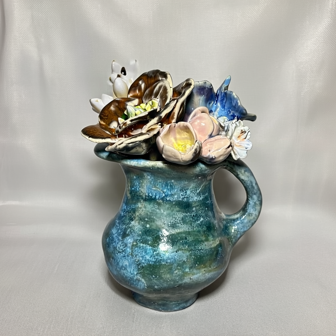 Перед вами готовая поэма о лете, воплощенная в керамике! Уютный кувшинчик с изящным носиком и удобной ручкой стал вазой для пышного букета полевых цветов. Каждый стебелек, ромашка и василек вылеплены вручную, создавая удивительно живую и объемную композицию. Эта работа не просто украсит вашу кухню или гостиную — она наполнит пространство теплом деревенского утра, ароматом луговых трав и настроением беззаботного летнего дня.