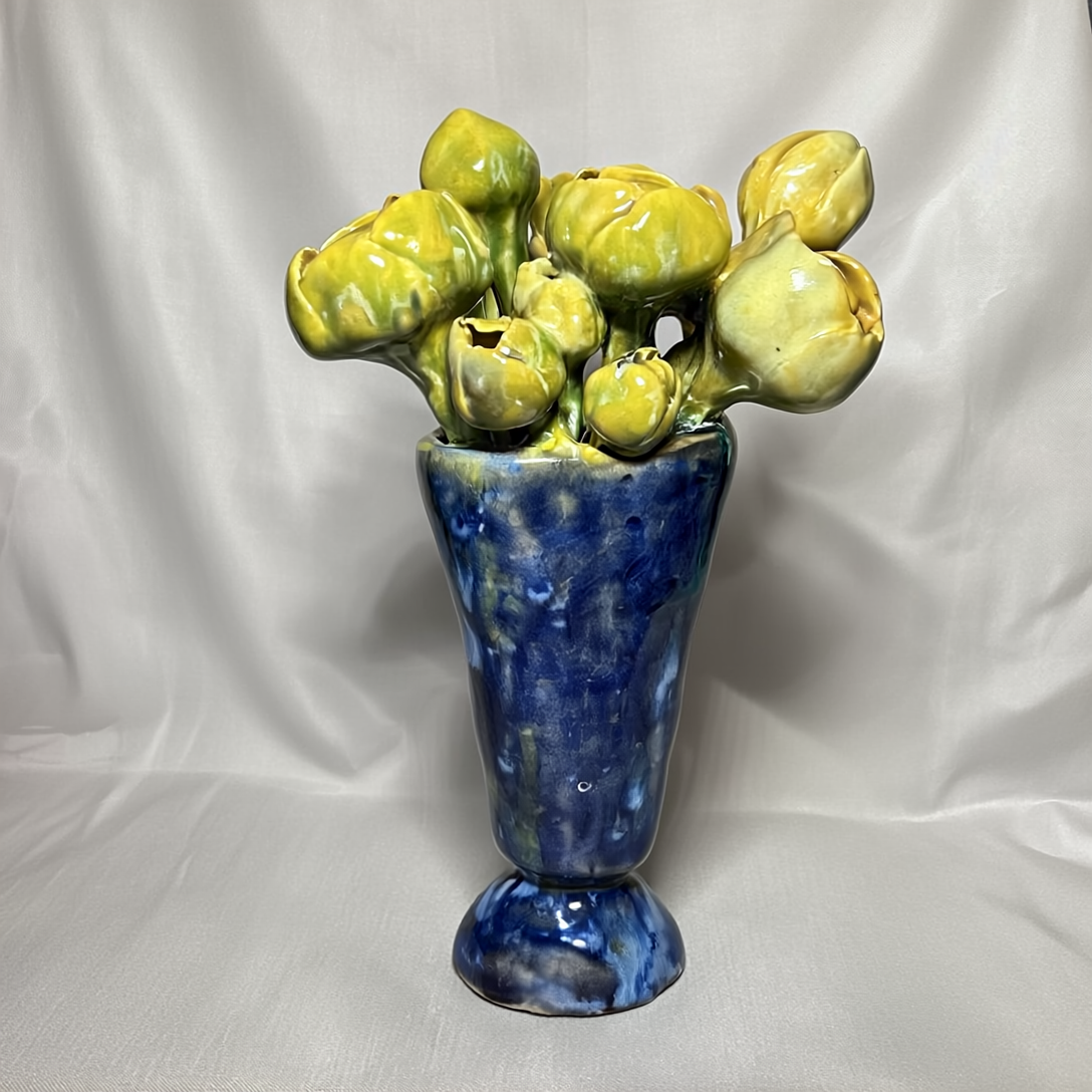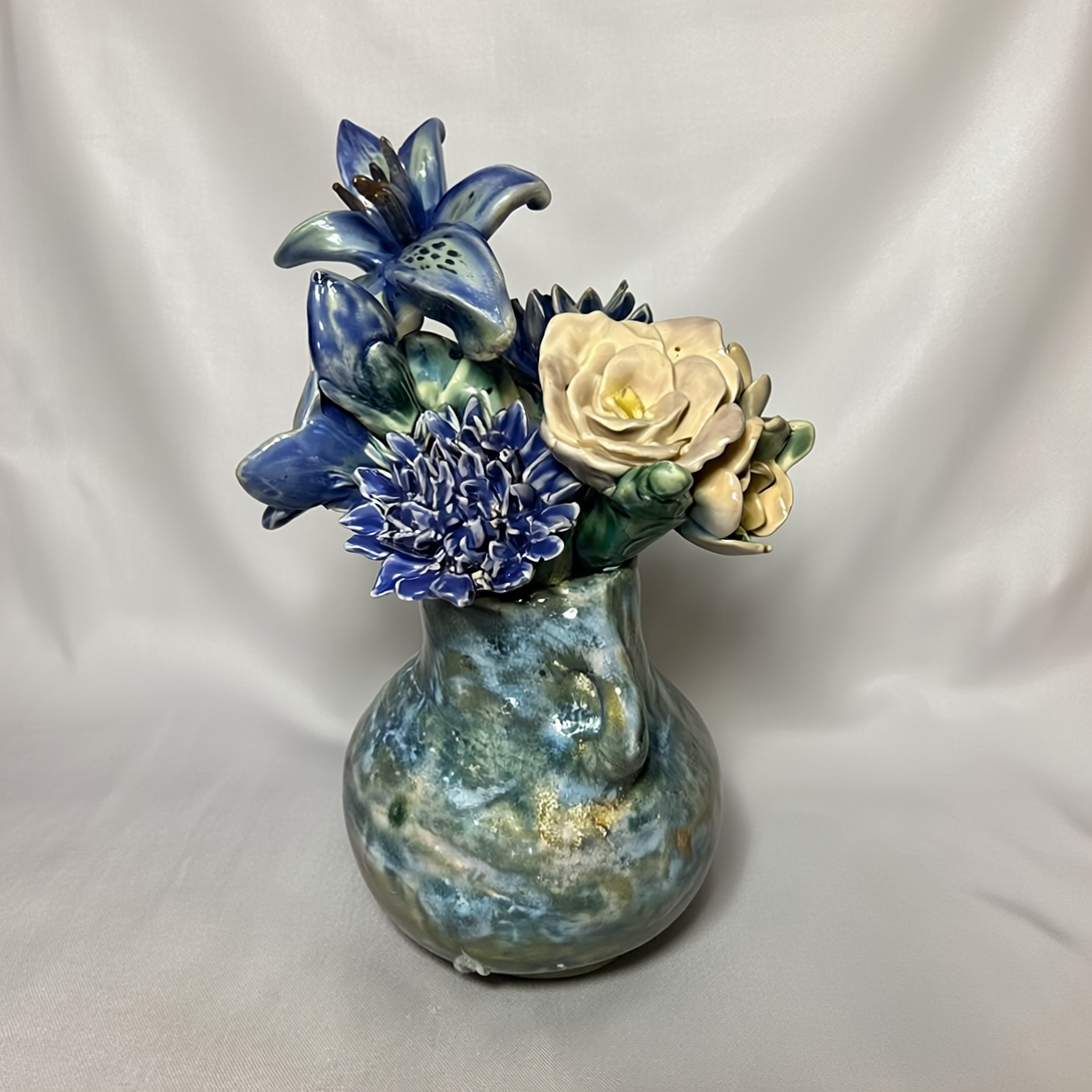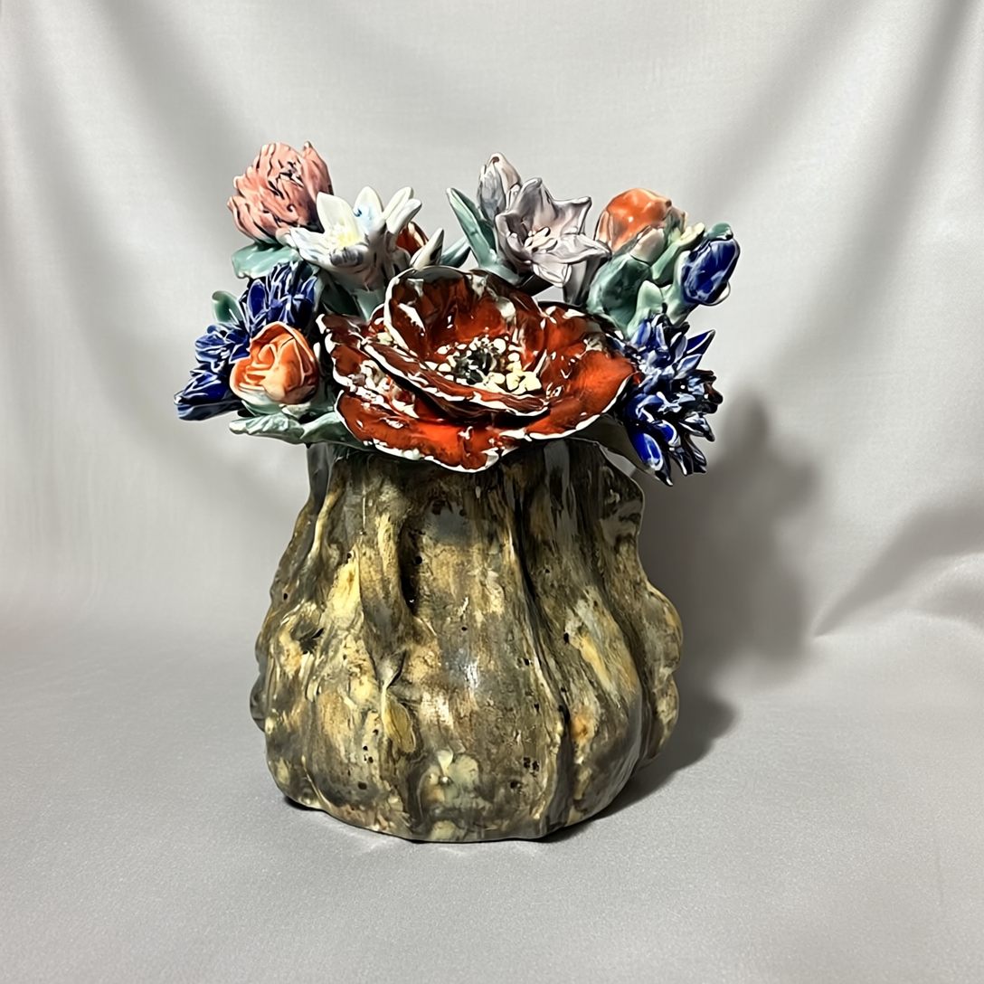 Гармоничный дуэт лилий и хризантем в этой керамической композиции рассказывает историю о чистоте и мудрости. Благородные лилии символизируют духовную чистоту, а пышные хризантемы — долголетие и жизненную энергию. Игра объемов и изгибов создает динамичную композицию, где каждый цветок занимает свое идеальное место. Ручная роспись тонко передает естественные оттенки лепестков, делая этот букет вечным напоминанием о гармонии природы.
