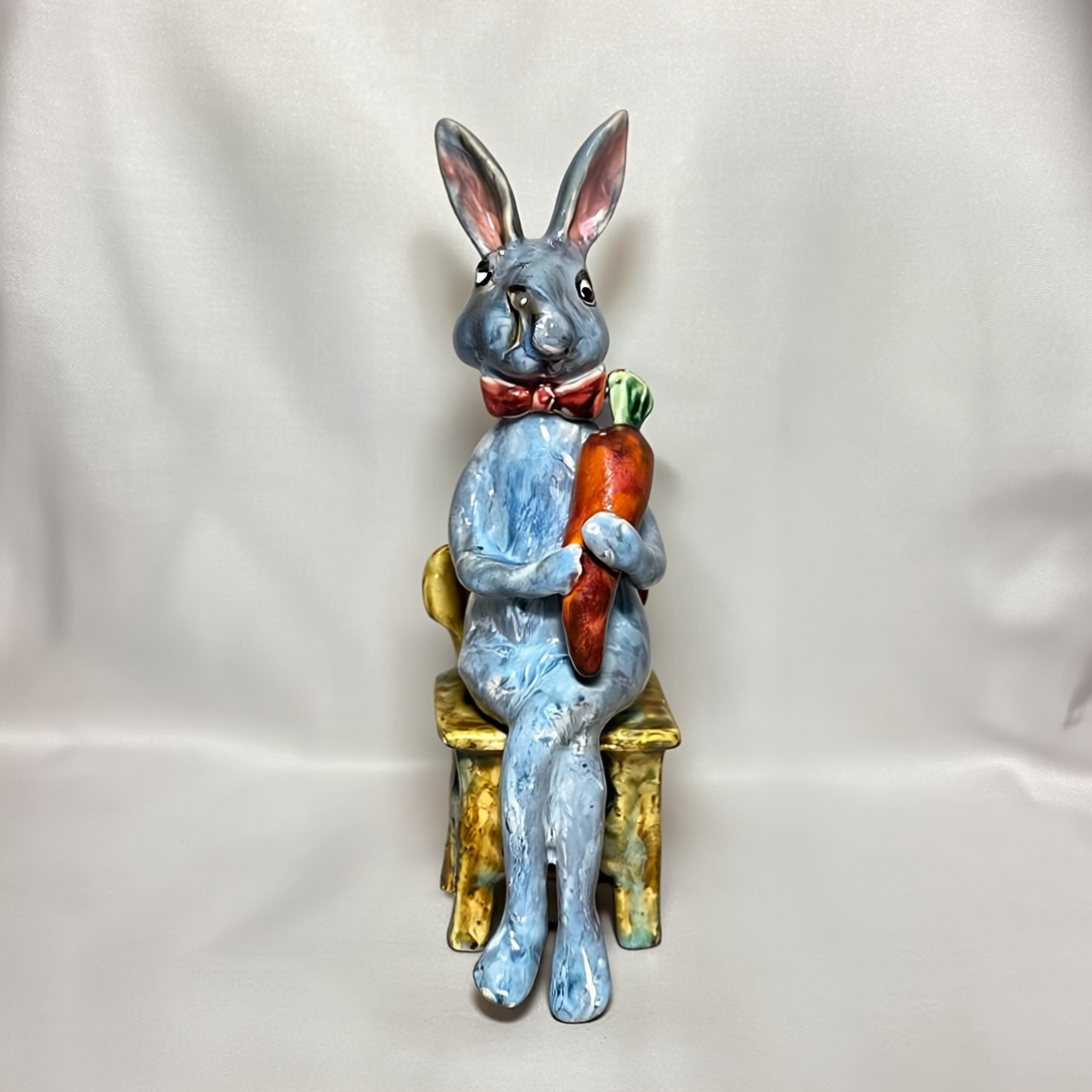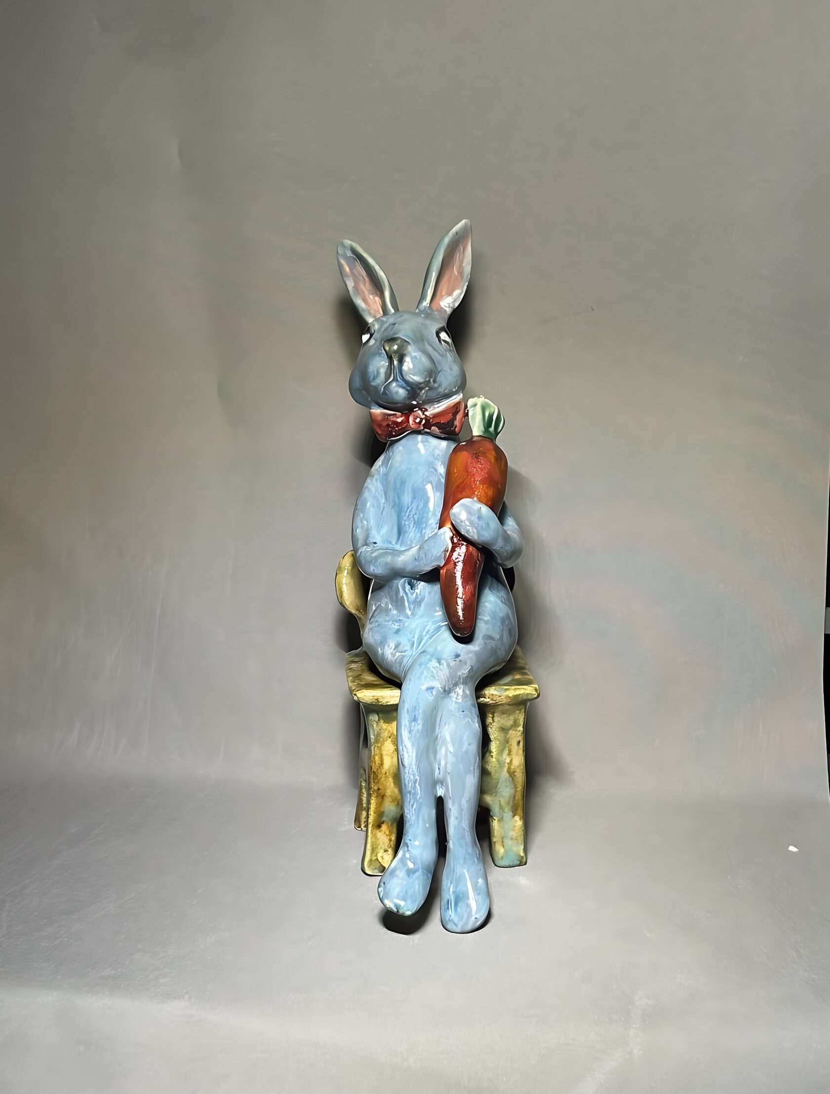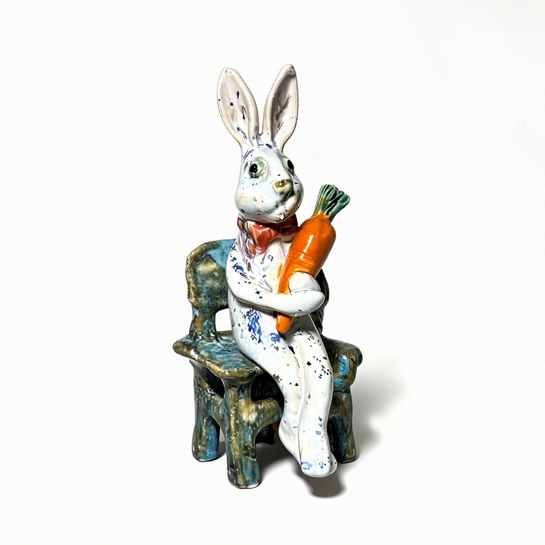 Перед вами — самый элегантный обитатель сада! Этот керамический зайчик восседает на стуле с видом истинного джентльмена. В его лапках — хрустящая морковка, а на шее красуется главный акцент образа — нежная бабочка, словно живой галстук-бабочка. Эта композиция виртуозно сочетает в себе милую наивность и утонченную детализацию. Ручная лепка и роспись наделили персонажа особым характером, делая его уникальным арт-объектом, который привнесет в ваш интерьер ноту легкой романтики и безупречного вкуса.