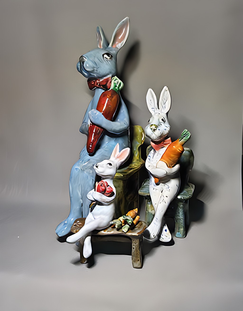 Трогательная керамическая сценка с тремя зайцами на стульях. Взрослые зайцы с морковками и малыш с цветком создают душевную и живую атмосферу. Эта уникальная ручная работа станет милым акцентом на кухне, в детской или на полке в гостиной, напоминая о семейном тепле и заботе. Прекрасный подарок на новоселье, рождение ребенка или просто для создания хорошего настроения.