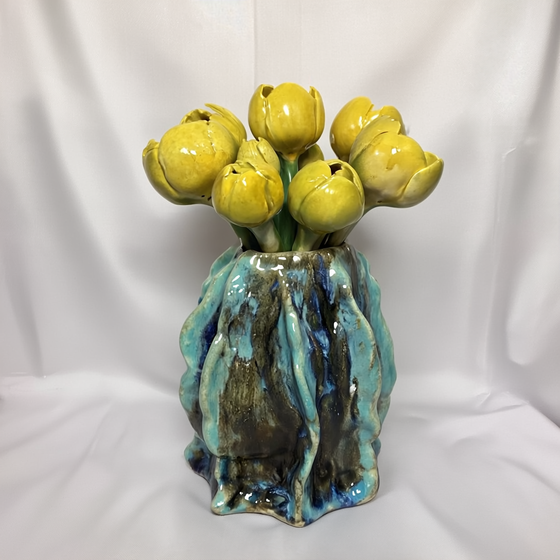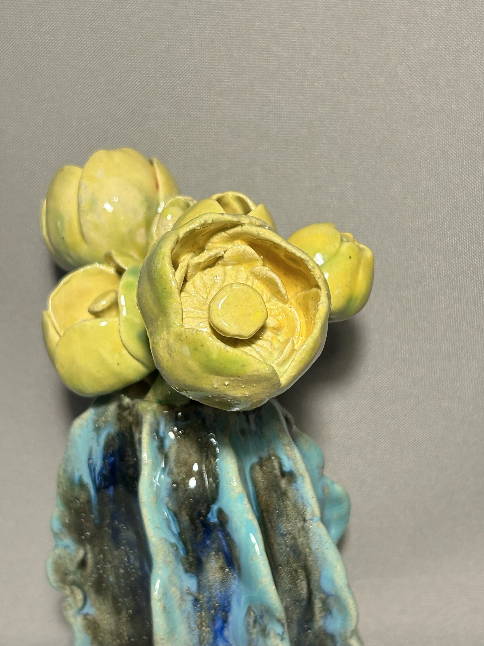 Изящная керамическая ваза, вдохновленная природными линиями и изысканностью стиля ар-нуво. Желтые кувшинки, плавно переходящие в стенки сосуда, создают целостную художественную композицию. Лаконичная форма и насыщенный желтый цвет делают эту вазу самодостаточным элементом декора, который преобразит любой интерьер — от классики до современной гостиной.