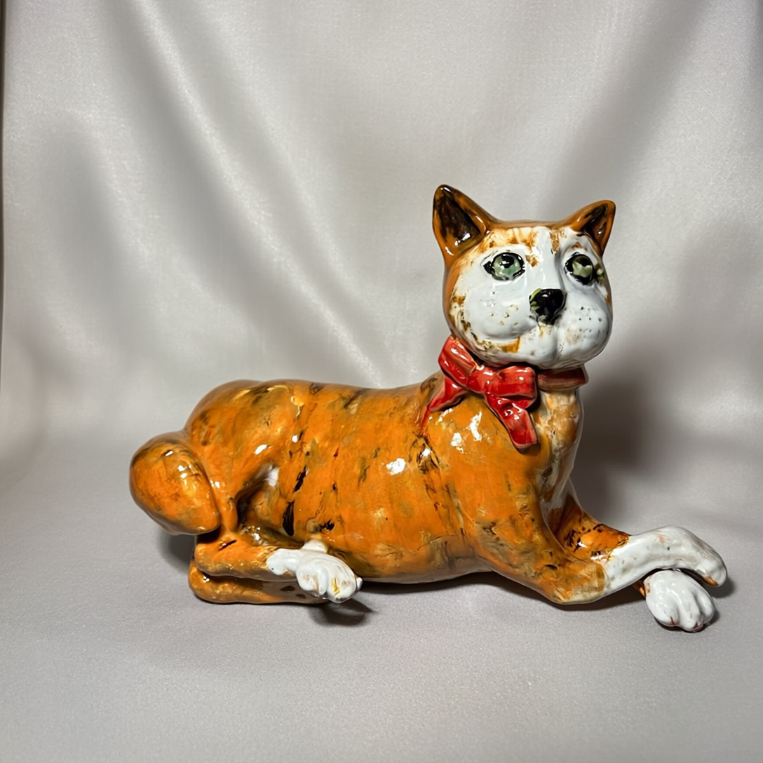 Умилительный керамический кот с яркой рыжей шерсткой и нарядным бантиком. В его образе — изящество, тепло и легкое озорство. Он станет милым талисманом на вашей полке, рабочем столе или подоконнике, ежедневно даря хорошее настроение.
