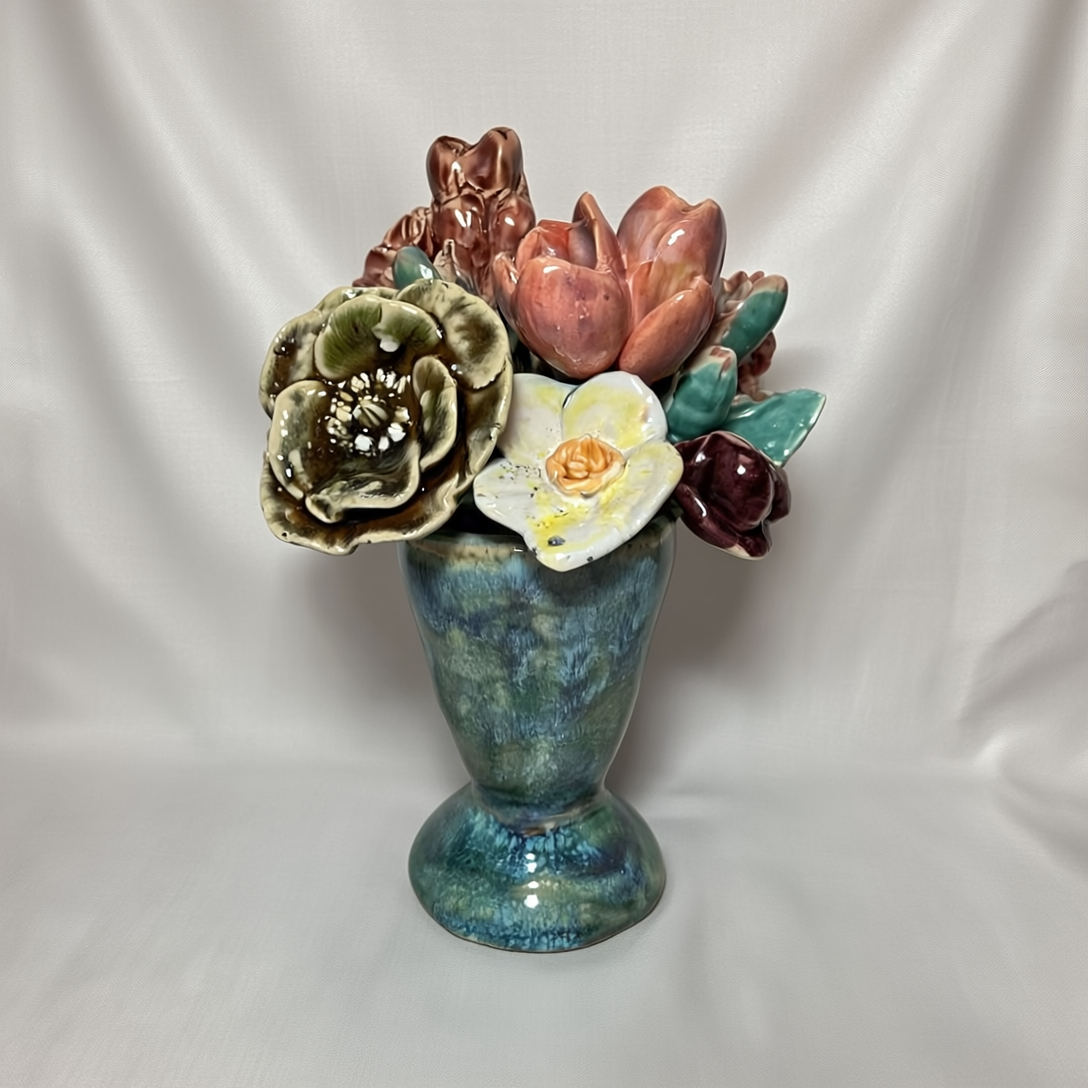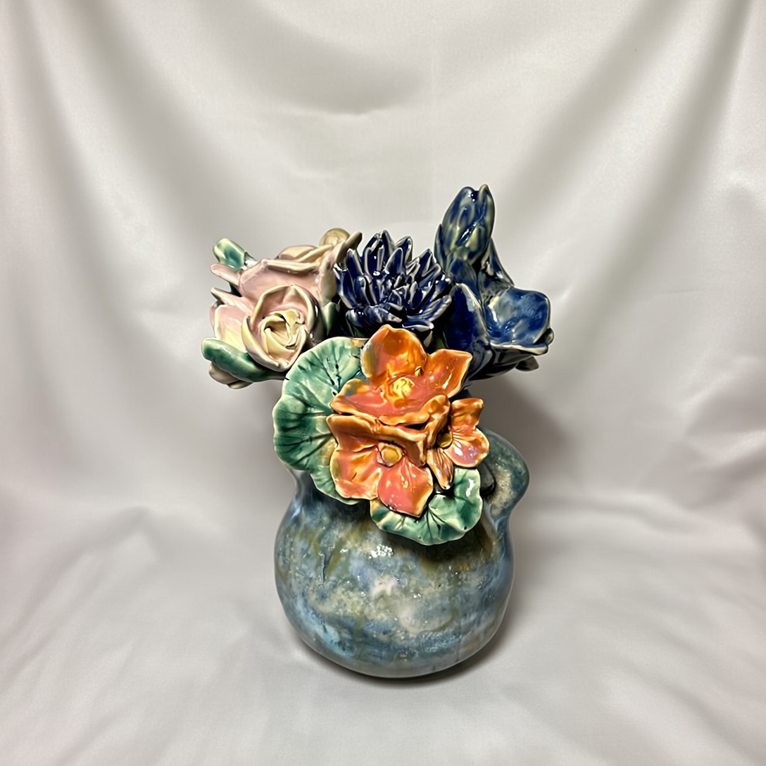 Эта керамическая композиция объединила три символа совершенства в одном изящном букете! Бархатистые розы, пышные хризантемы и утонченные ирисы создают идеальную гармонию форм и оттенков. Каждый цветок вылеплен вручную с ювелирной точностью — от изгибов лепестков до нежных тычинок. Керамический кувшинчик с мягкими линиями служит идеальной основой для этого вечного букета, создавая готовое произведение искусства для вашего интерьера. Композиция, которая говорит на языке красоты и изящества.