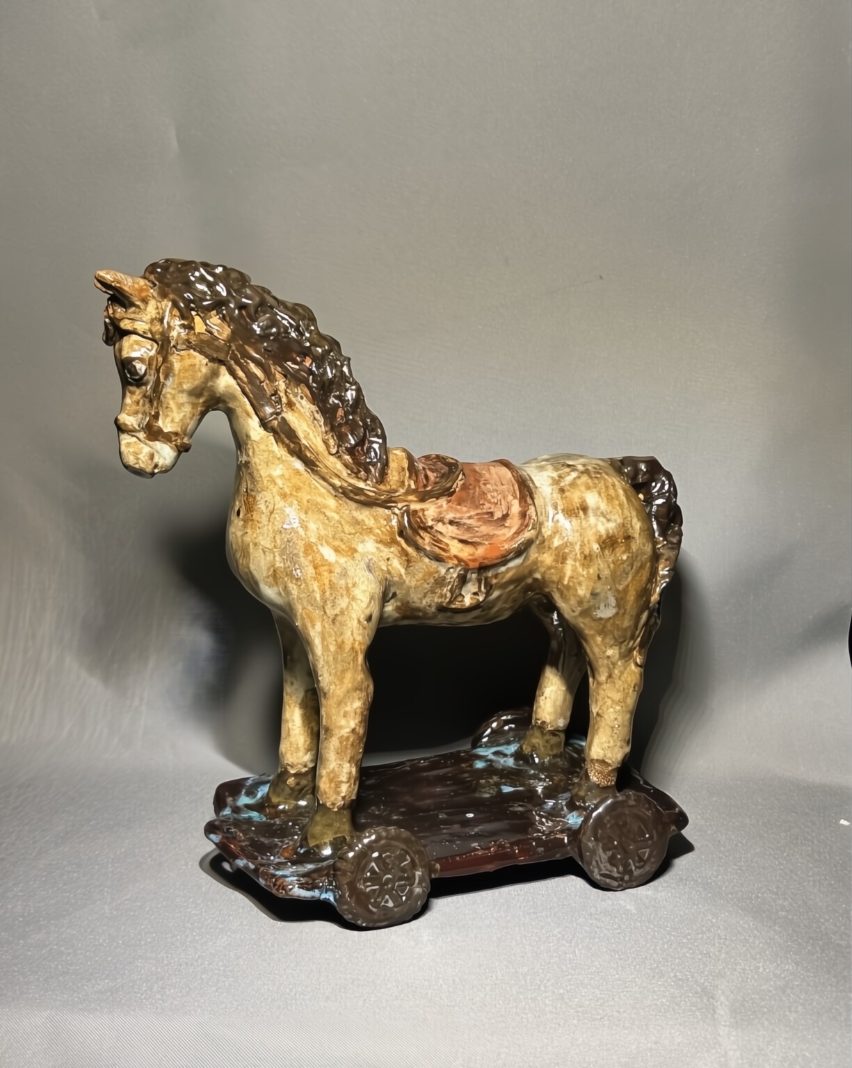 Эта керамическая лошадка на платформе с колесиками — олицетворение теплых воспоминаний и беззаботного детства. Будто сошедшая со страниц старинной книги игрушек, она сохранила свою прелесть и характер. Каждая линия, от гривы до изгиба платформы, тщательно вылеплена вручную, что делает ее не просто игрушкой, а настоящим арт-объектом, наполненным душой. Эта композиция станет трогательным украшением вашего интерьера, вызывая улыбку и нежные чувства.