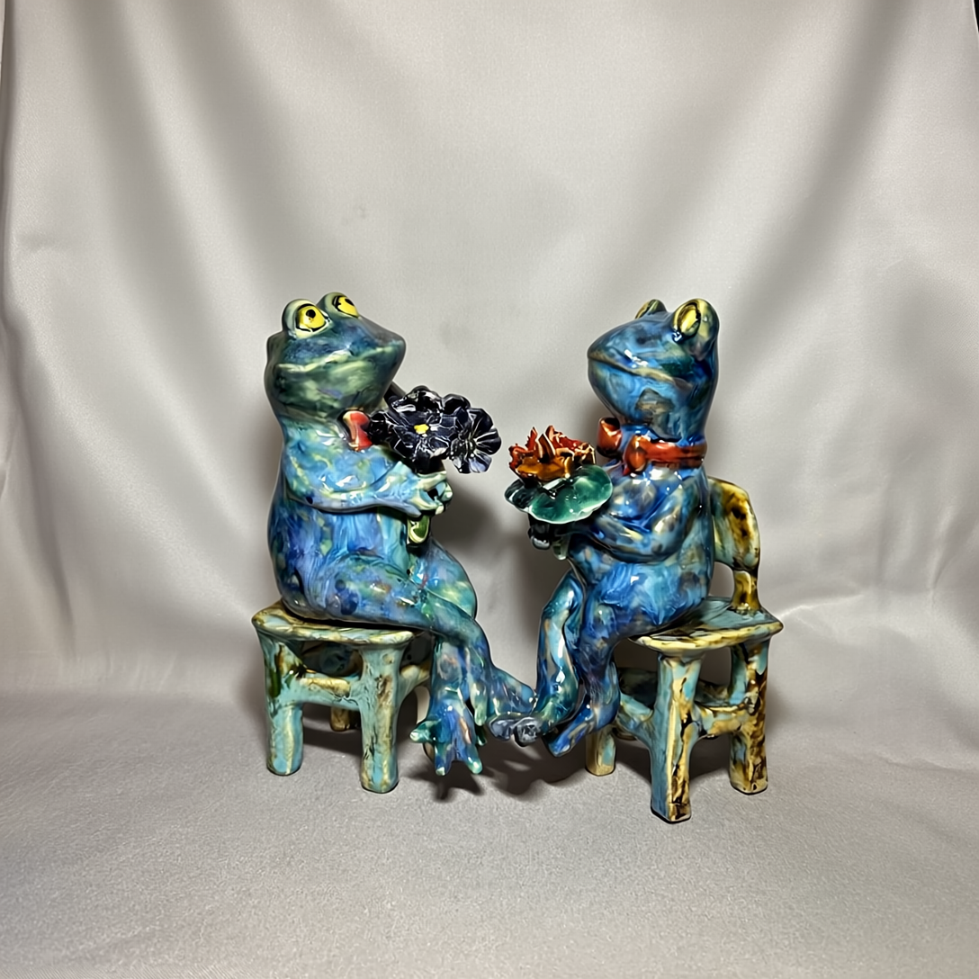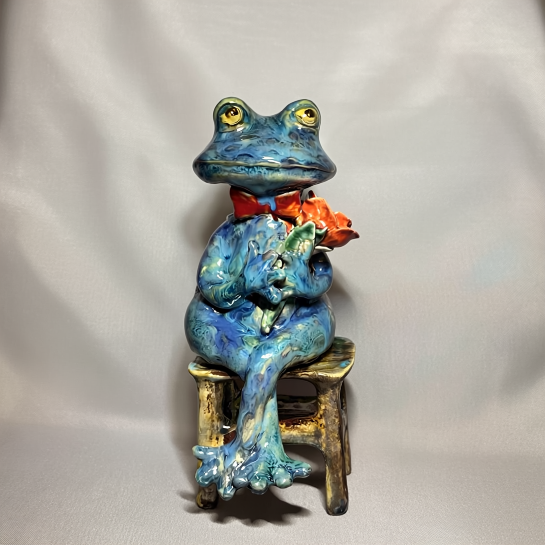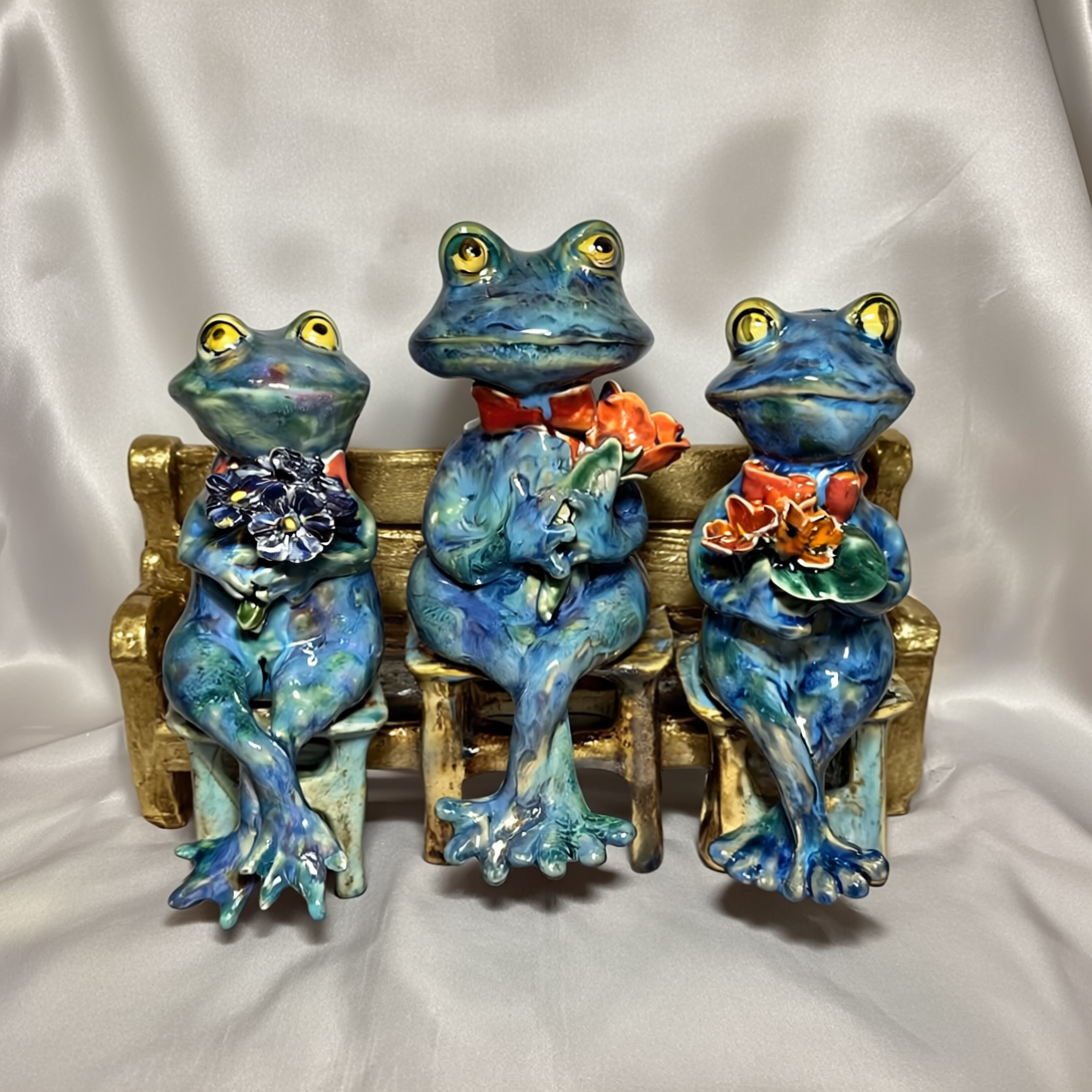 Это очаровательное лягушачье семейство устроило настоящую фотосессию! Три керамические лягушки в элегантных галстуках-бабочках восседают на стульчиках, демонстрируя свои цветочные букеты. В этой композиции с юмором и изяществом обыграна тема семейной гармонии и трогательной заботы. Идеальный подарок для создания настроения в интерьере — каждая деталь от бабочек до лепестков выполнена вручную.
