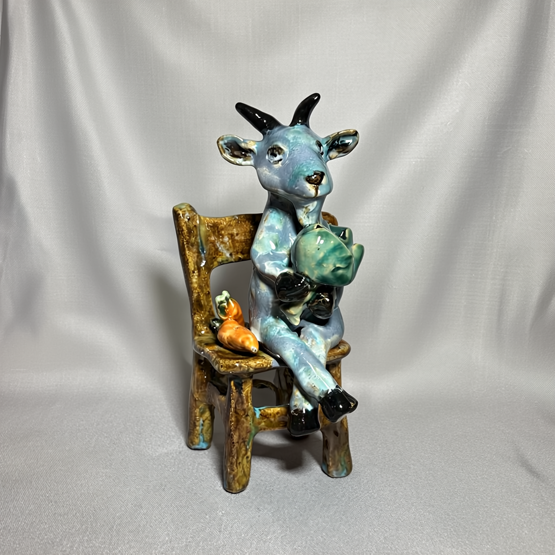Этот керамический козёл явно знает толк в хорошей закуске! Усевшись на стул с видом настоящего деревенского аристократа, он с гордым видом демонстрирует свой трофей — сочный кочан капусты. В его позе и выражении «лица» читается самодостаточность и легкая ирония. Эта детализированная композиция, выполненная вручную, станет изюминкой вашей кухни или гостиной, вызывая улыбку у всех гостей. Отличный подарок для людей с чувством юмора и ценителей оригинального декора.