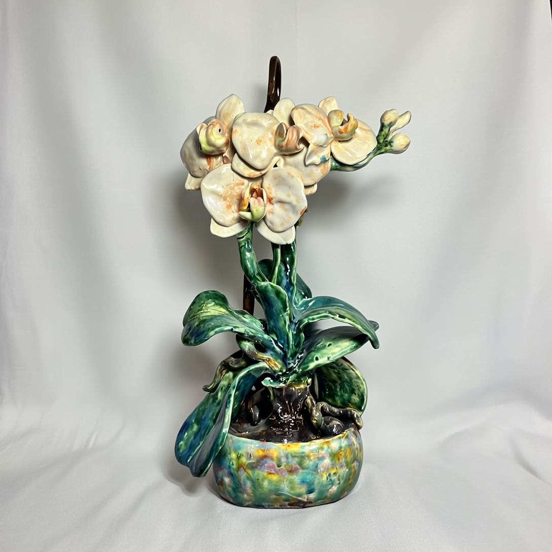 Мечтаете об орхидее, которая не требует ухода? Ваша мечта сбылась! Эта керамическая орхидея в элегантном кашпо сочетает в себе хрупкую красоту живого цветка и практичность ручной работы. Изящная форма лепестков, тщательно проработанная текстура и естественные изгибы стебля создают полное ощущение настоящего растения. Не нуждается в поливе, освещении и подкормке — просто разместите её на подоконнике и десятилетиями наслаждайтесь безупречным видом.