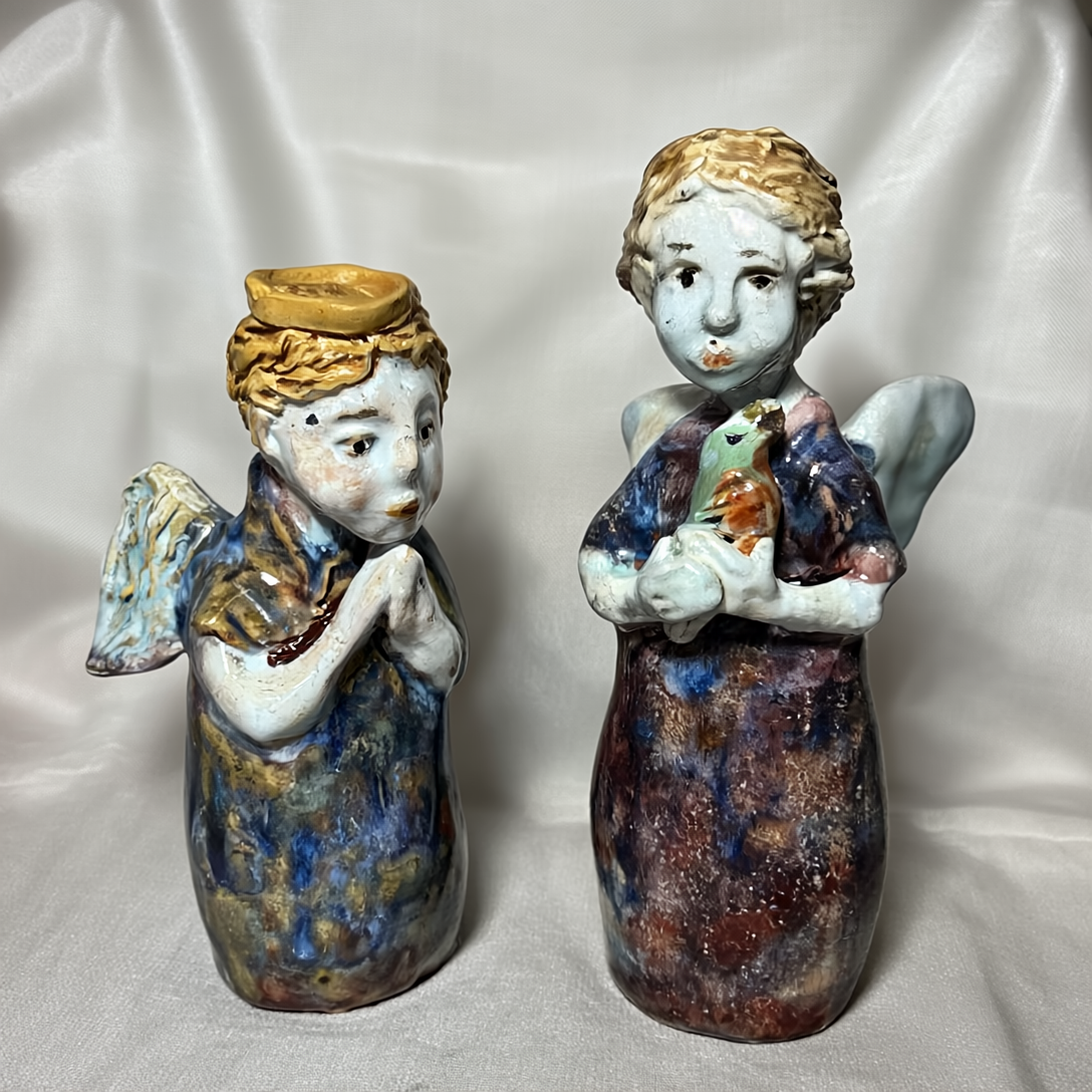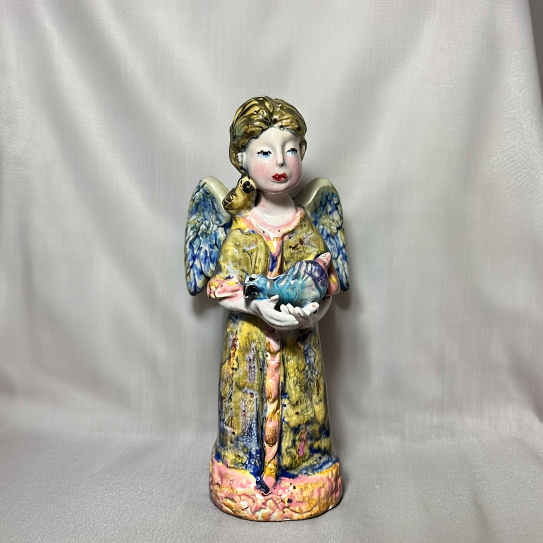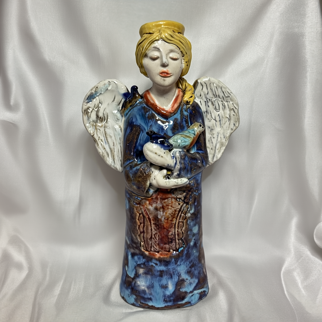 Керамическая фигурка, изображающая трогательного ангелочка, который бережно держит в своих руках маленькую птичку. Эта композиция символизирует хрупкость мира, заботу и добрые вести. Каждая деталь проработана вручную, делая фигурку уникальным арт-объектом для вашей полки или искренним подарком, наполненным глубоким смыслом.