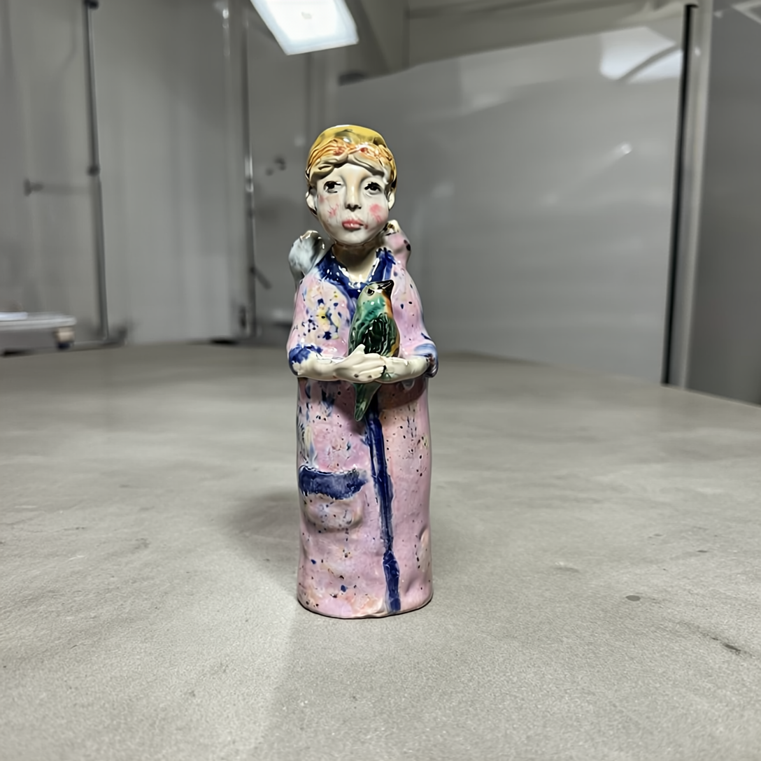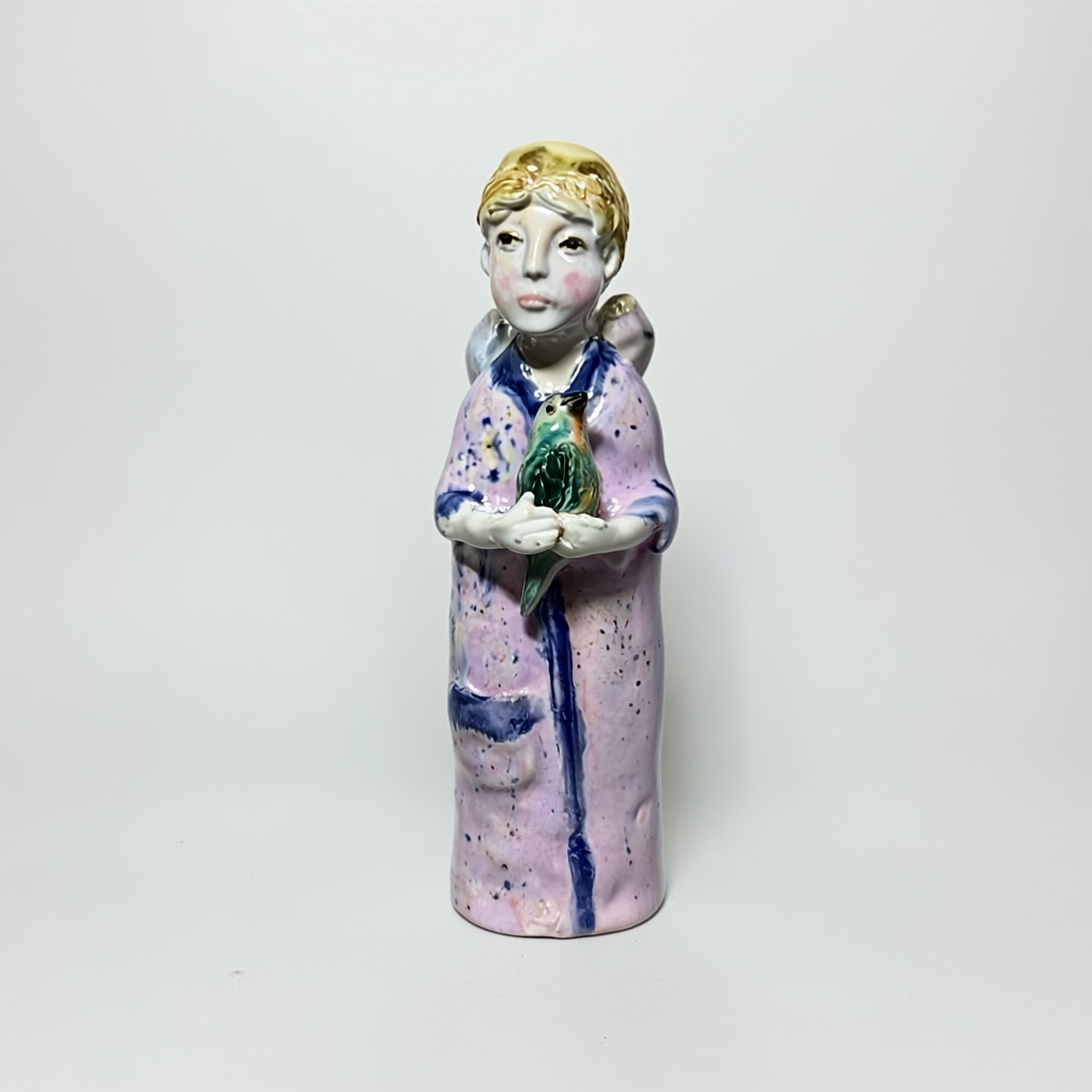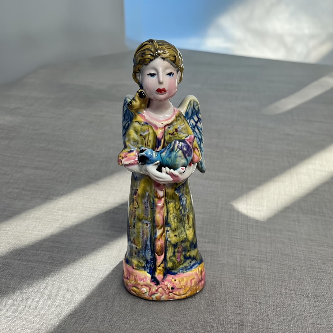 Керамическая фигурка, изображающая трогательного ангелочка, который бережно держит в своих руках маленькую птичку. Эта композиция символизирует хрупкость мира, заботу и добрые вести. Каждая деталь проработана вручную, делая фигурку уникальным арт-объектом для вашей полки или искренним подарком, наполненным глубоким смыслом.