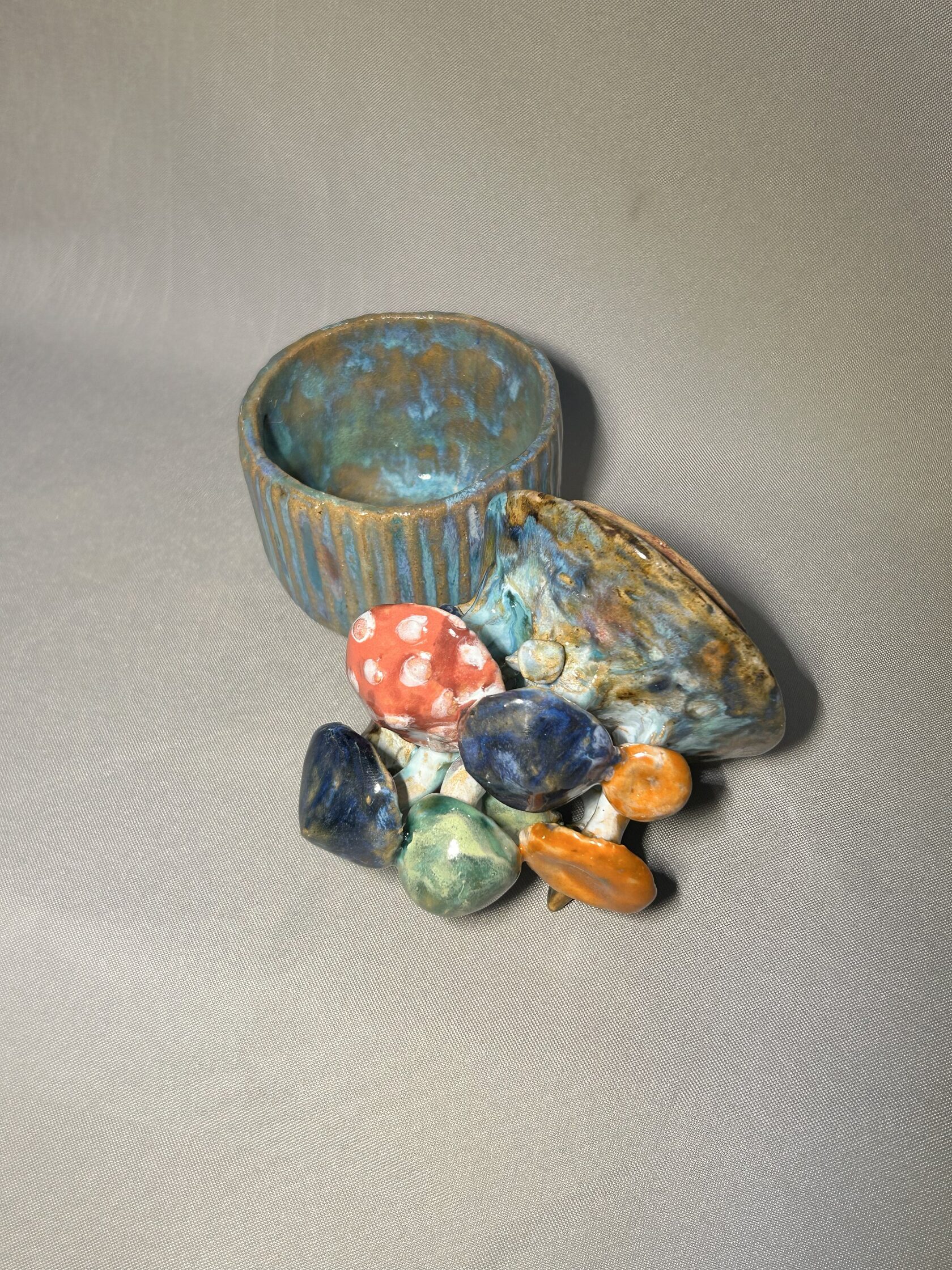 Эта керамическая вазочка словно вобрала в себя всё очарование летнего луга! Ромашки, васильки, колокольчики и незабудки сплелись в пёстром хороводе, создавая атмосферу деревенского уюта и безмятежности. Каждый цветок вылеплен вручную с удивительной точностью — от нежных лепестков ромашки до пушистых соцветий клевера. Композиция сохраняет тёплую энергетику ручной работы и подарит вашему дому аромат полевых трав и щебет птиц, даже в самый хмурый день. Символика полевых цветов: