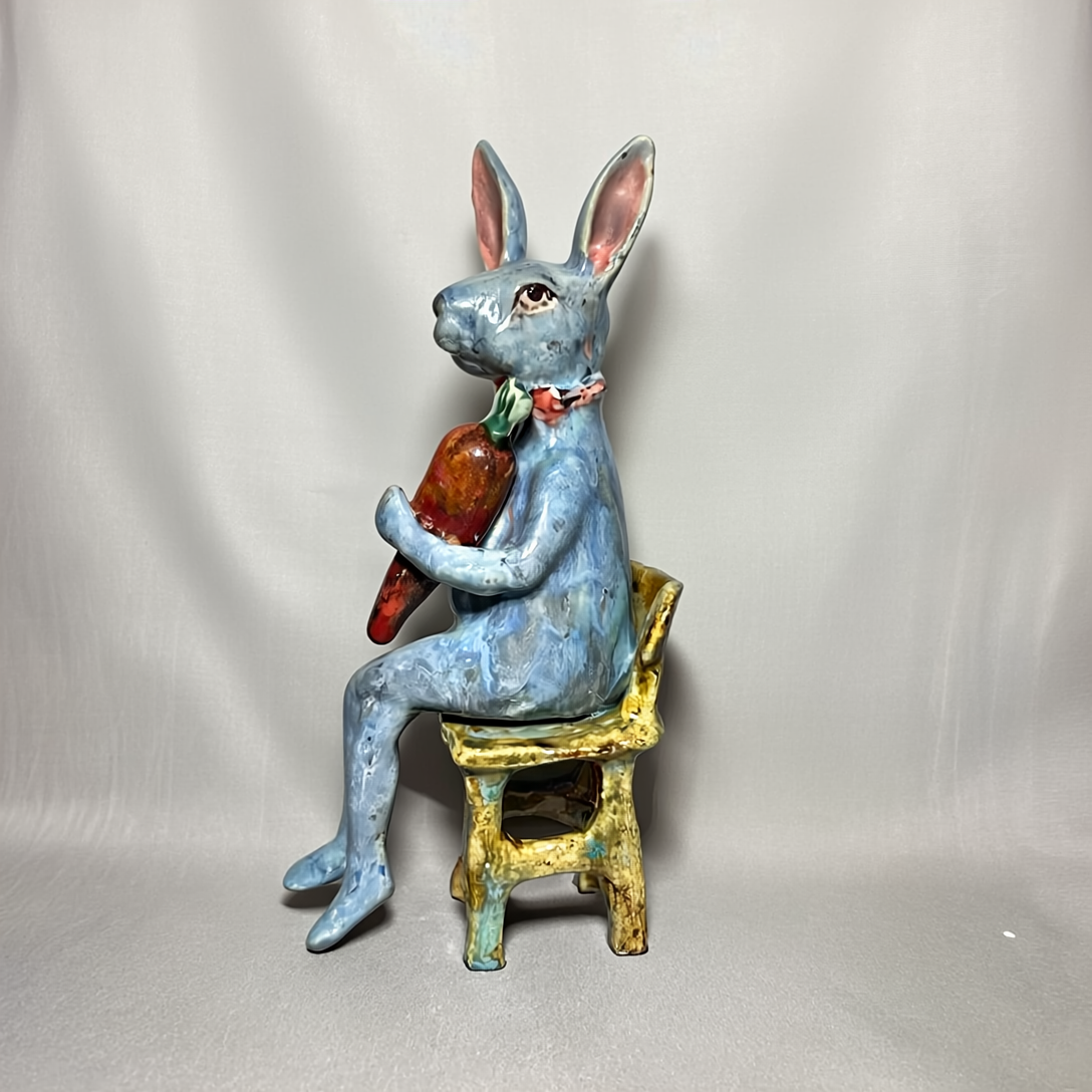 Перед вами — самый стильный заяц в городе! Усевшись на свой стульчик с деловым видом и в нарядном галстуке-бабочке, он не забыл и о практической стороне жизни — в его лапках красуется сочная морковка. Образ, полный остроумия и милого противоречия, не оставит равнодушным никого. Эта душевная ручная работа станет изюминкой вашего интерьера, вызывая улыбку и добавляя пространству игривого настроения.