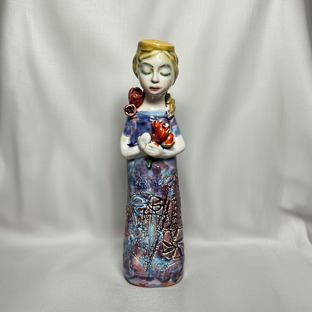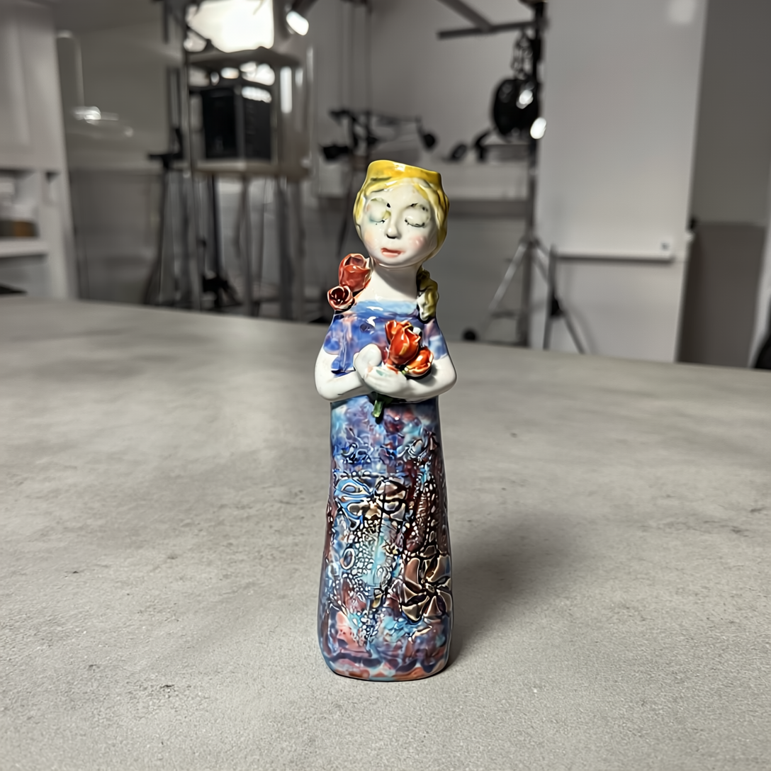 Эта керамическая фигурка рассказывает историю о чувствах, которые важнее зрения. Девушка с золотистой косой и закрытыми глазами полностью погружена в момент: она не видит, а чувствует — прохладу стеблей, шелковистость лепестков и дурманящий аромат тюльпанов. Композиция — метафора надежды, новой жизни и способности находить красоту через прикосновение и сердце. Уникальная ручная работа для тех, кто ценит глубокие образы и искусство с философским подтекстом.