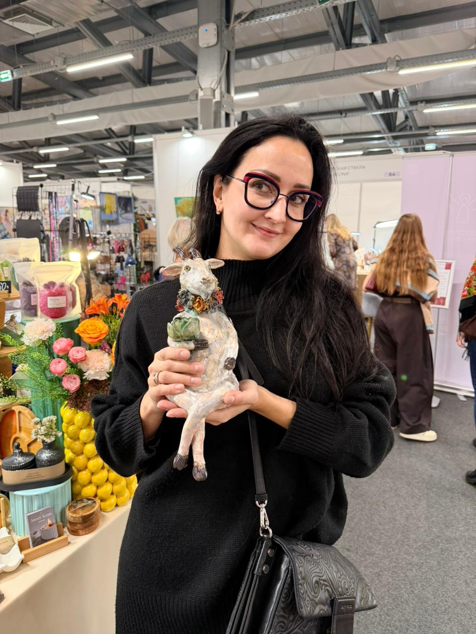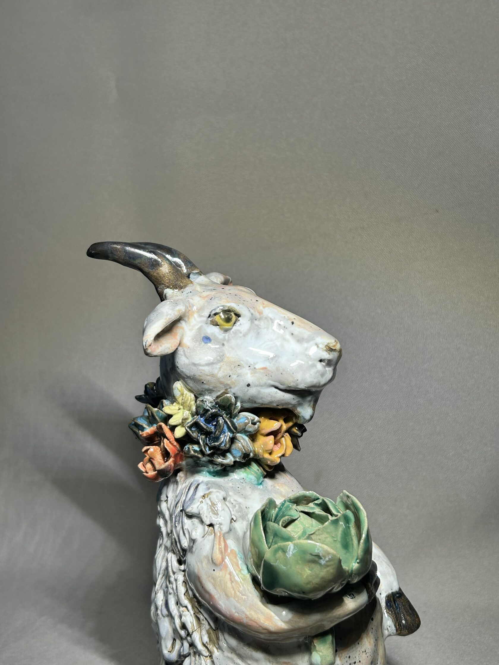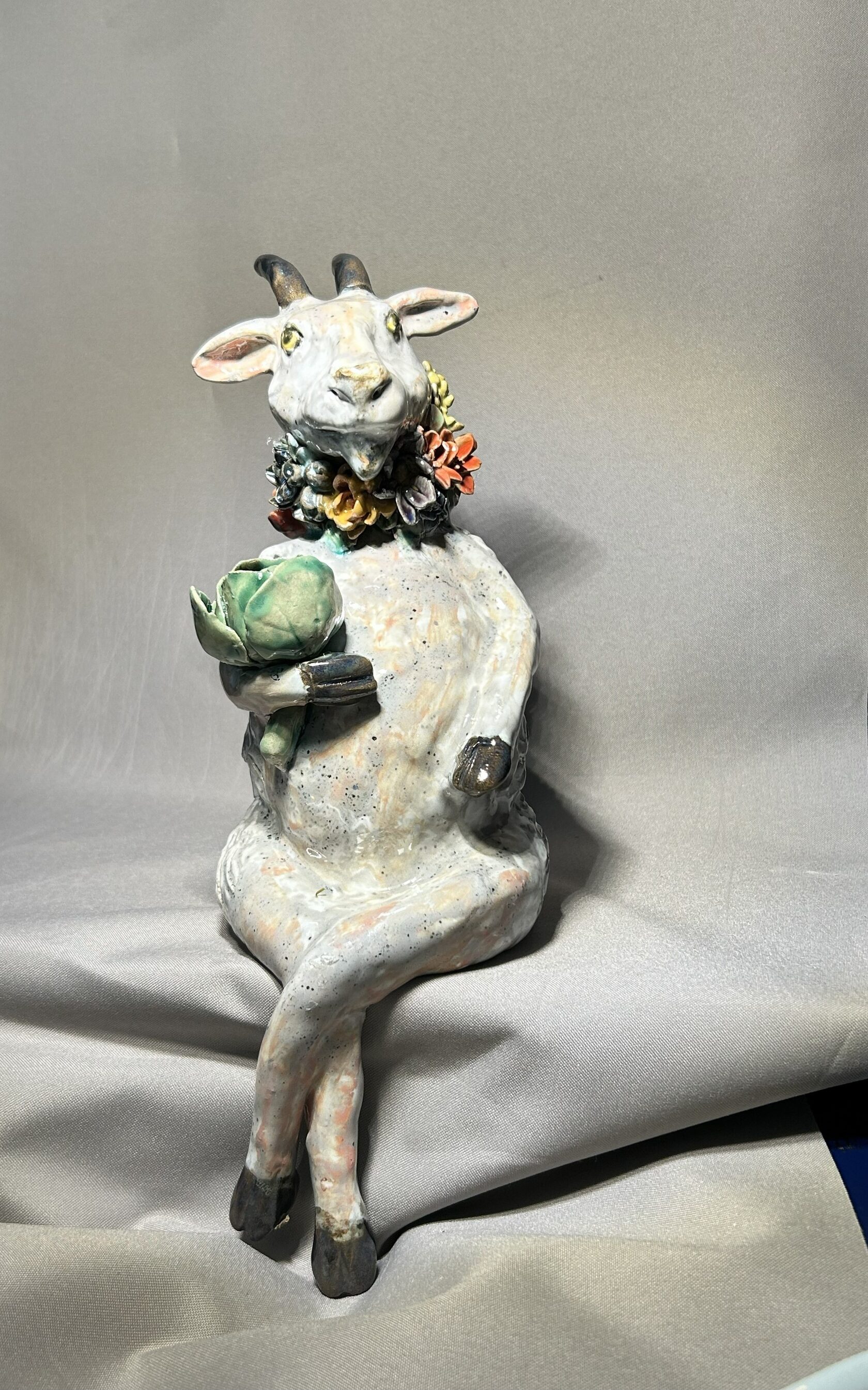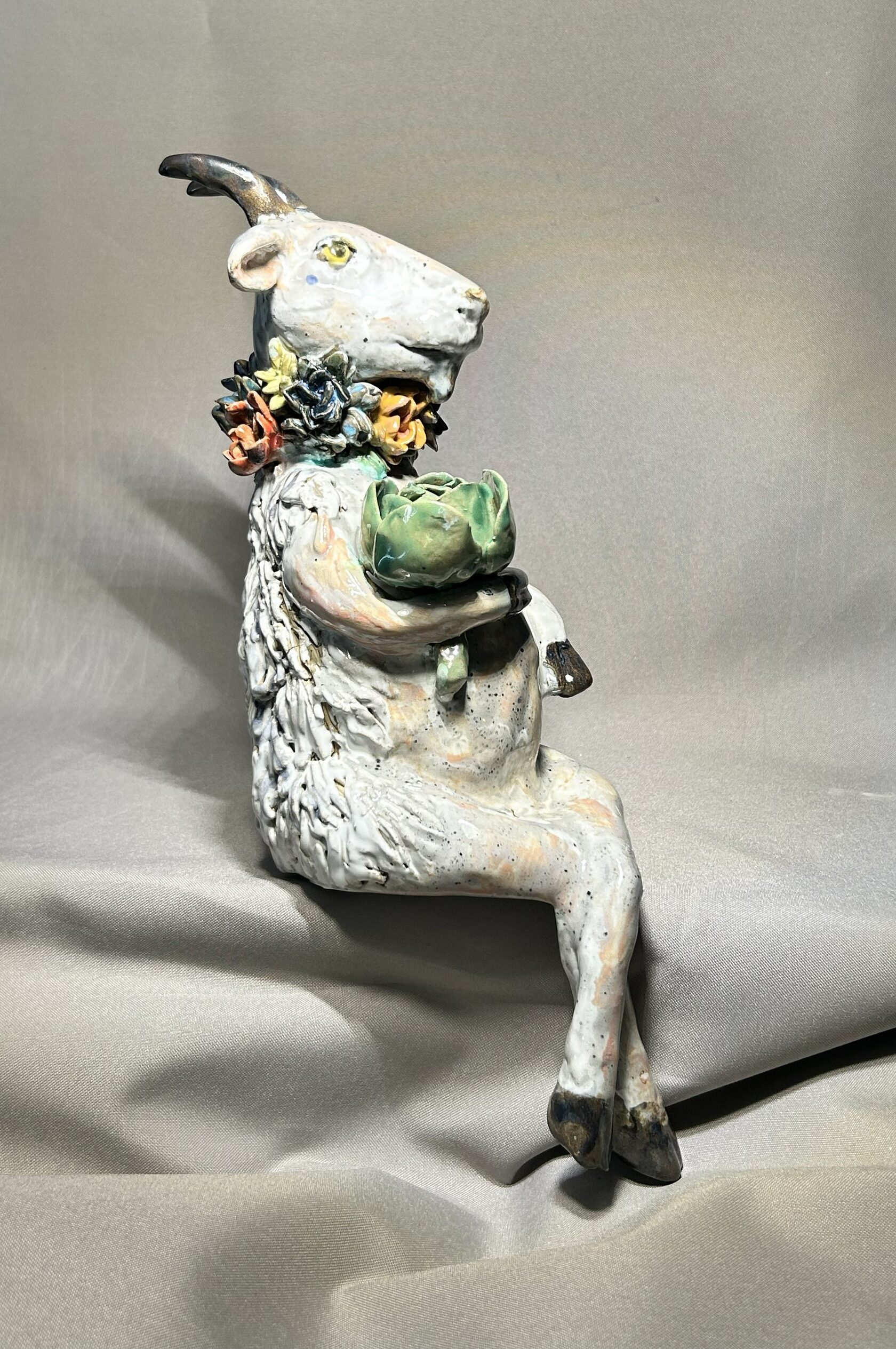 Эта керамическая козочка — настоящее воплощение деревенского уюта и простых радостей! Усевшись по-человечески, свесив задние ножки, она с детским восторгом и гордостью сжимает в своих копытцах целый кочан сочной капусты. А ее главное украшение — нежный венок из полевых цветов на шее — добавляет образу волшебства и нежности. Идеальный акцент для кухни, дачного дома или полки в гостиной.
