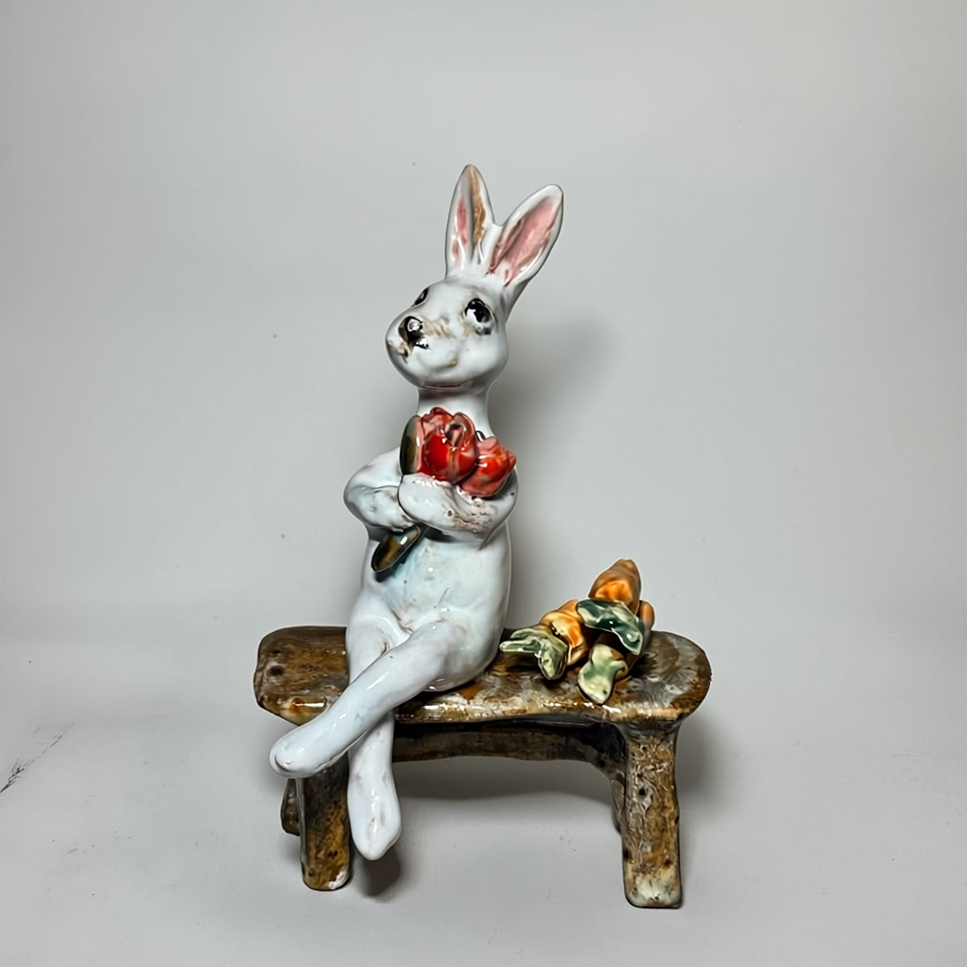 Эта керамическая композиция переносит в тихий уголок летнего сада. Зайчик присел на деревянную скамейку, чтобы насладиться моментом покоя. В одной лапке он нежно сжимает скромный полевой букетик, а рядом разложил свой законный трофей — свежую морковку с зеленым хвостиком. В этой сценке гармонично соединились практичность и романтика, напоминая о простых радостях жизни. Идеальное украшение для подоконника, комода или каминной полки, которое наполнит ваш дом теплом и уютом.