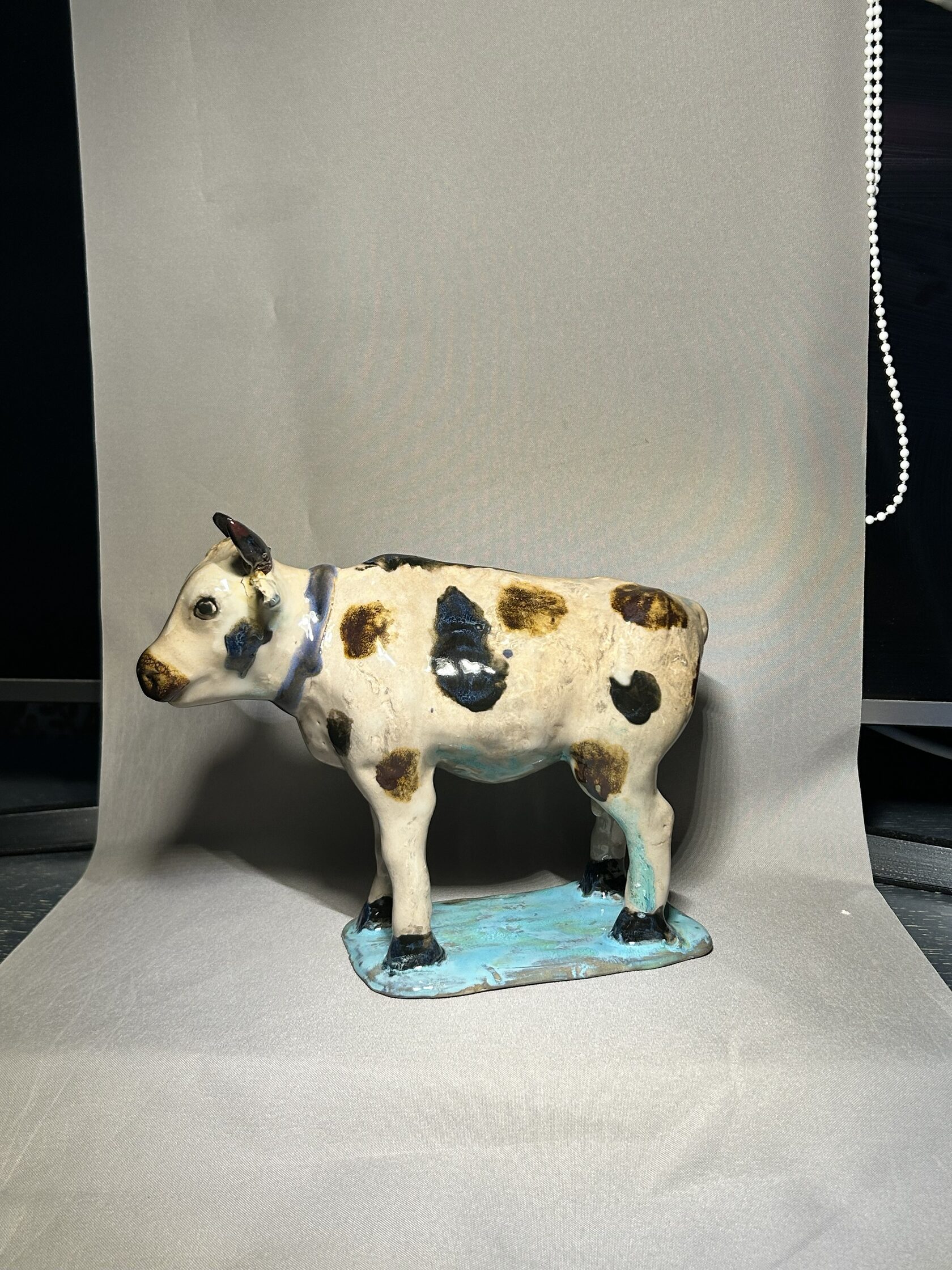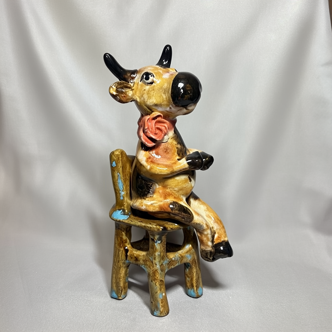 Эта керамическая коровка — воплощение изящества и деревенского шарма! Восседая на своем стульчике с видом истинной леди, она демонстрирует свой самый элегантный аксессуар — нежную розочку на атласной ленточке. В ее образе гармонично сочетаются милая наивность и утонченная детализация. Каждый элемент, от складочек на шее до текстуры дерева на стуле, тщательно вылеплен вручную. Эта композиция станет изысканным акцентом в вашем интерьере, привнося в него ноту теплого юмора и безупречного вкуса.