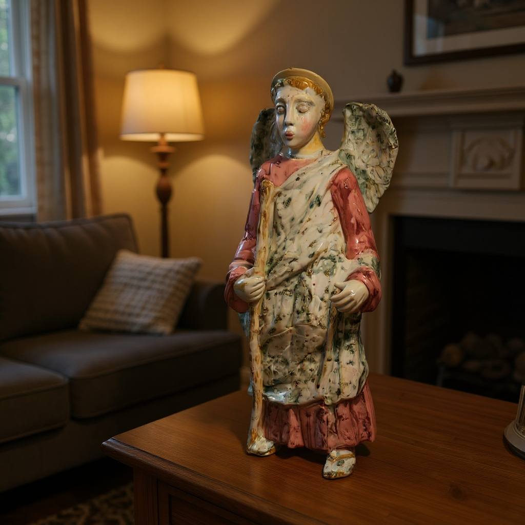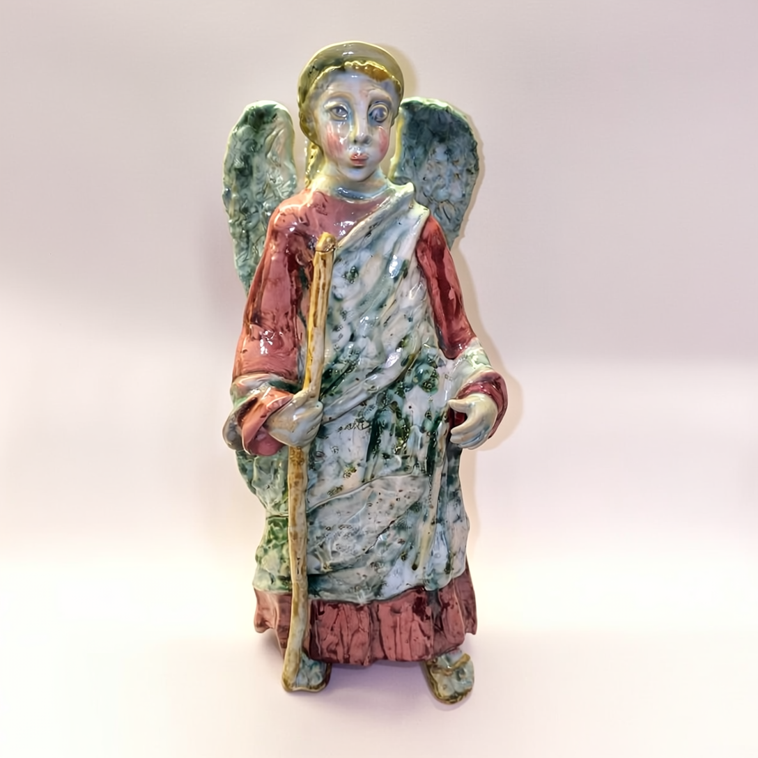 Этот керамический ангел-стражник с посохом — воплощение бдительности и духовной защиты. В его позе читается не грозная мощь, а торжественная готовность оберегать ваш покой. Каждая складка одеяния, каждое перо крыльев и деталь посоха вылеплены вручную, наполняя фигурку благородной силой. Установите его у входа в дом или в кабинете — и пусть этот молчаливый страж станет зримым символом незримой защиты для вас и вашей семьи.