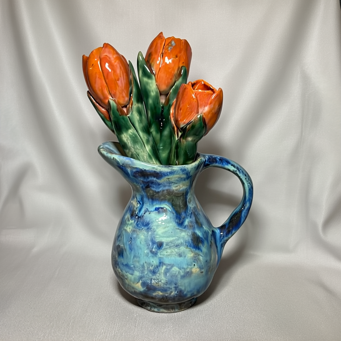 Этот солнечный букет коралловых тюльпанов в керамическом кувшинчике наполнит ваш дом теплом и свежестью первых весенних дней! Нежные бутоны с мягкими переходами оттенков и изящные стебли застыли в момент своего идеального раскрытия. Каждый тюльпан вылеплен вручную с удивительной точностью, а ручная роспись тонко передает игру света на бархатистых лепестках. Уютный кувшинчик с мягкими обводами дополняет композицию, создавая готовый образ прованского утра для вашего интерьера.