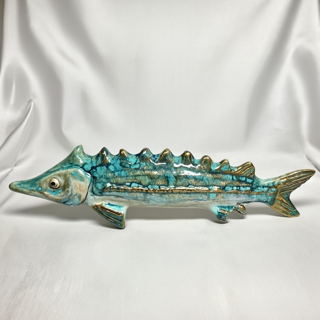 Благородный керамический осётр с выразительной пластикой и рельефной чешуей. Ручная лепка точно передает мощь и грацию этой древней рыбы, символизирующей мудрость и изобилие. Идеально смотрится на полке, рабочем столе или в интерьере в морской тематике. Устойчивое основание и прочная глазурь делают его долговечным украшением.